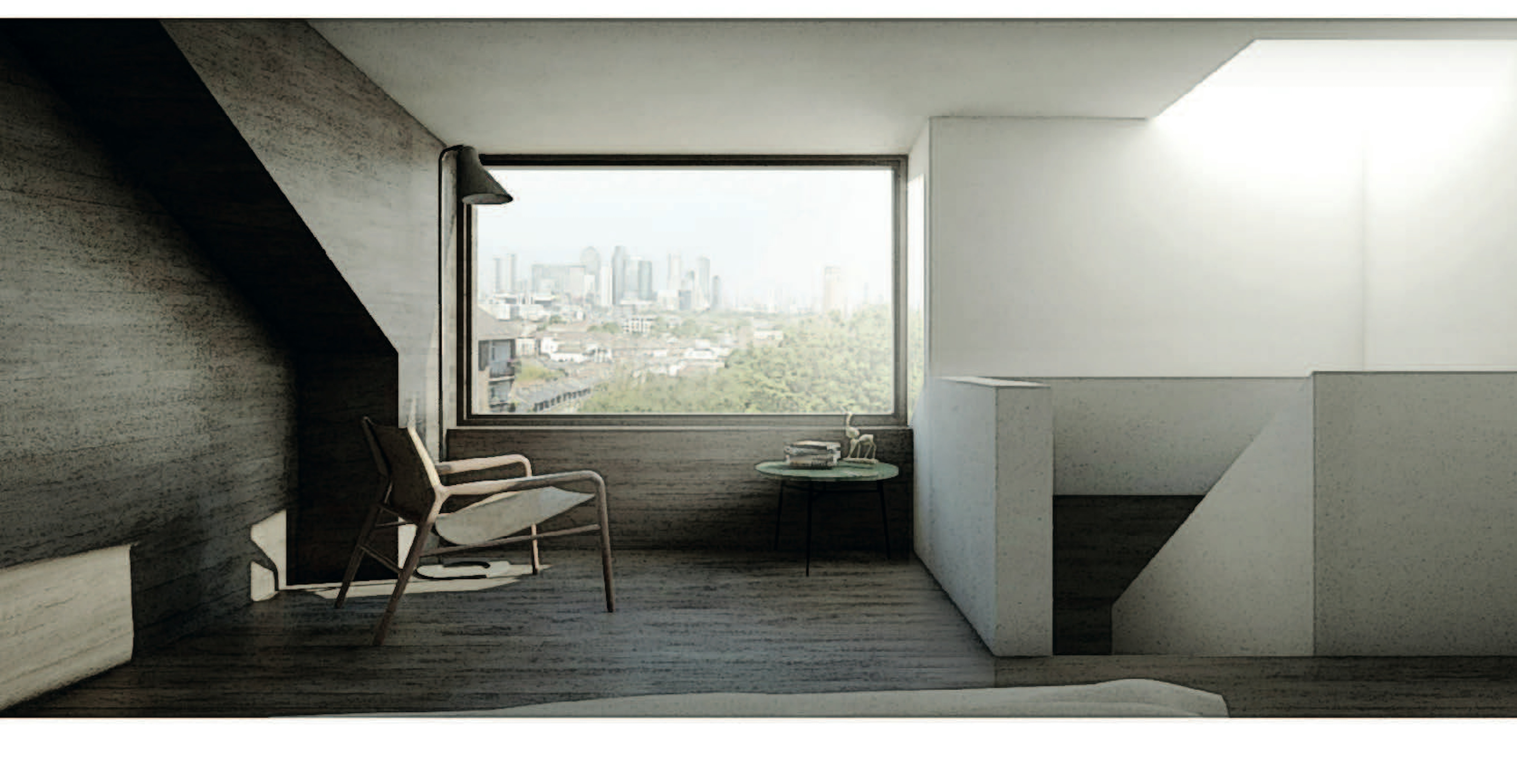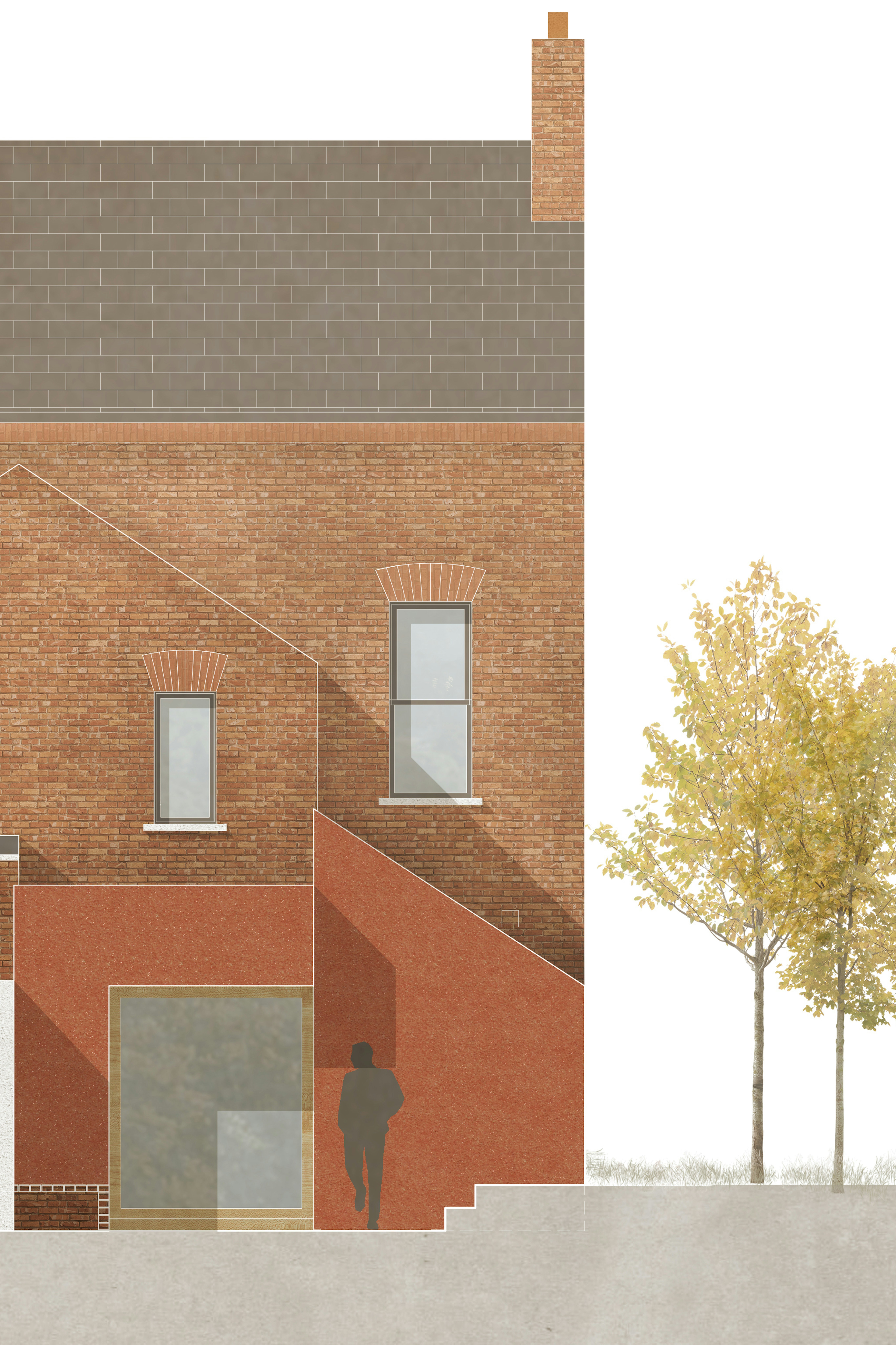 The new roof form reorientates the buildings silhouette - fixing a townscape issue, whilst availing of the new roof form internally to create vaulted, light-filled interiors. We are looking to create the new volumes with MMC techniques and explore self-finished materials to create some solid textured spaces.
