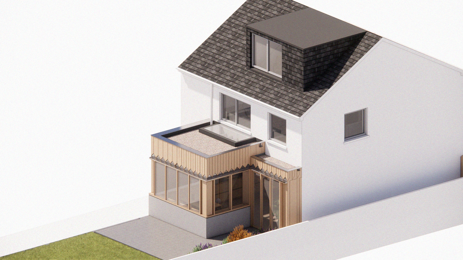 The design proposals include the reconfiguration & upgrade of the existing bungalow to present day environmental standards, with a new 85m2 single storey vaulted kitchen/living space orientated to capture south light and direct views of the mountains.