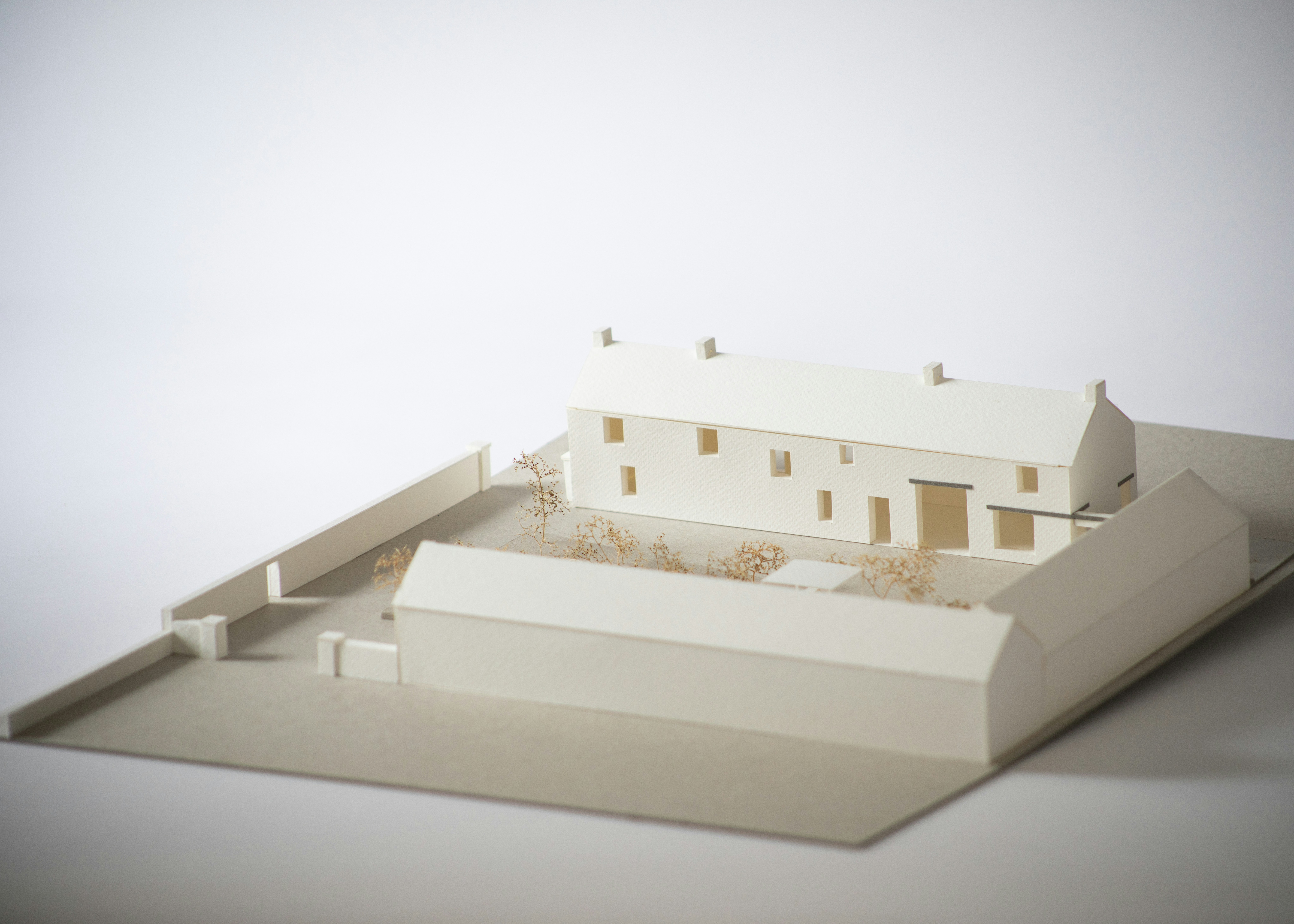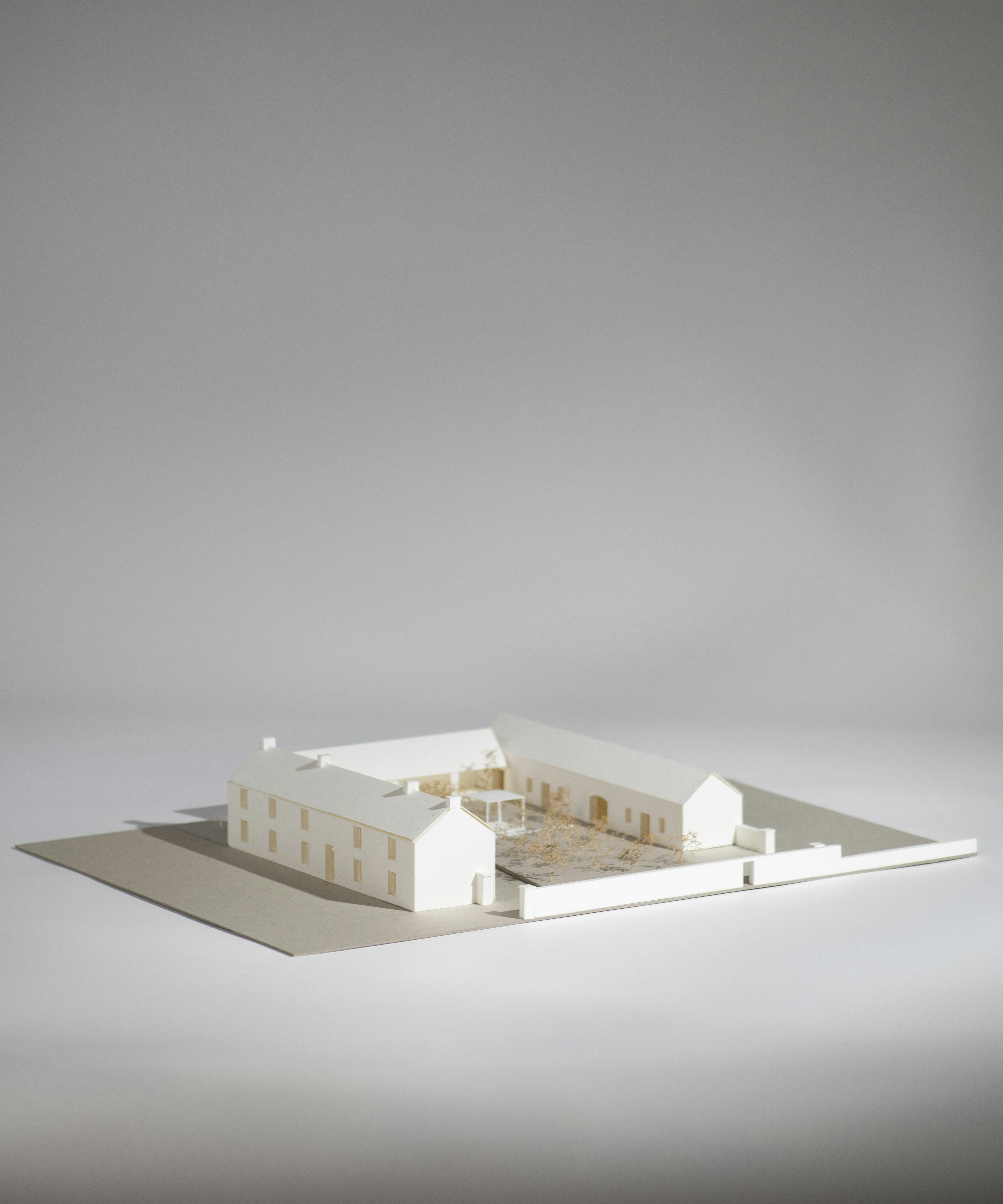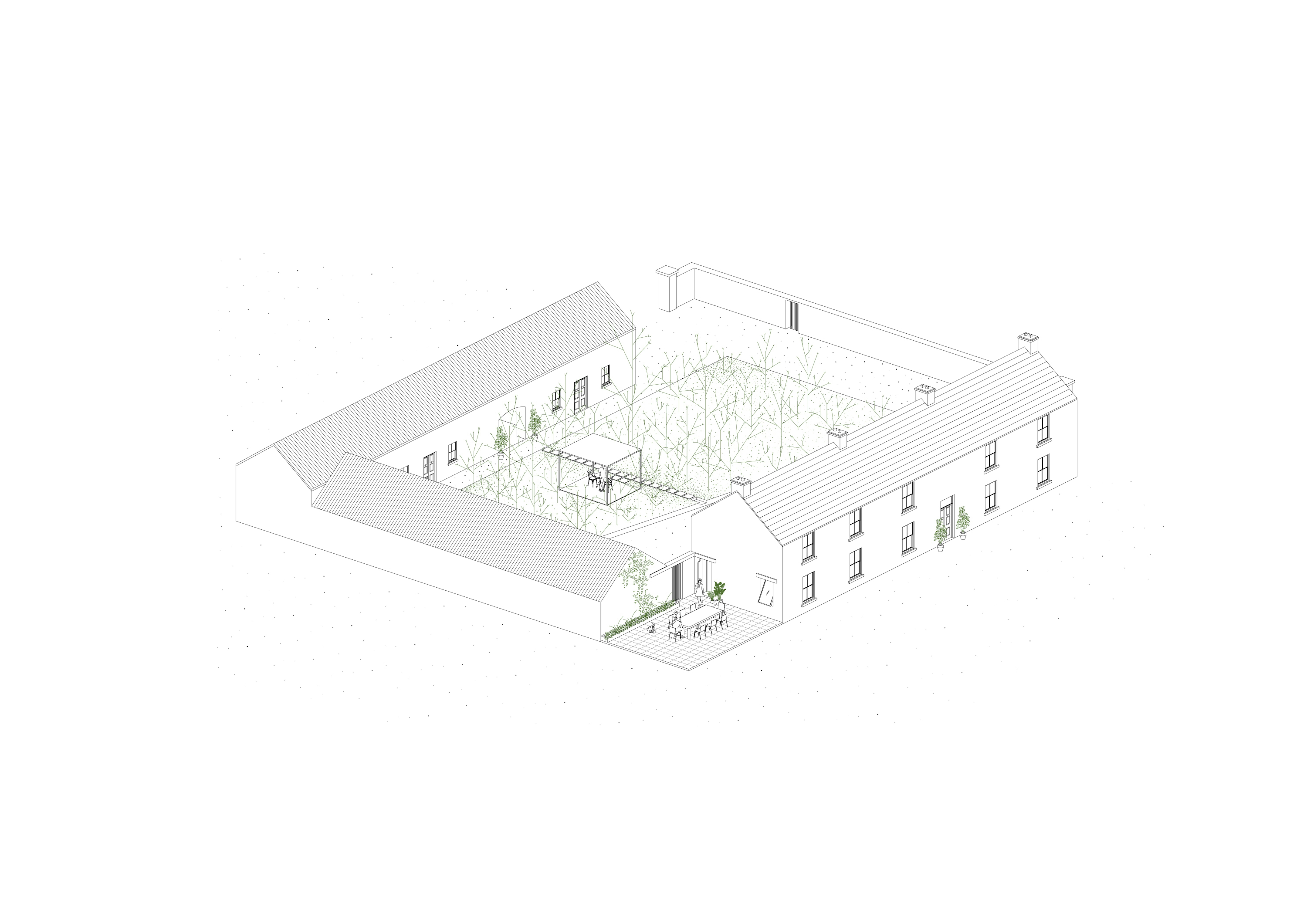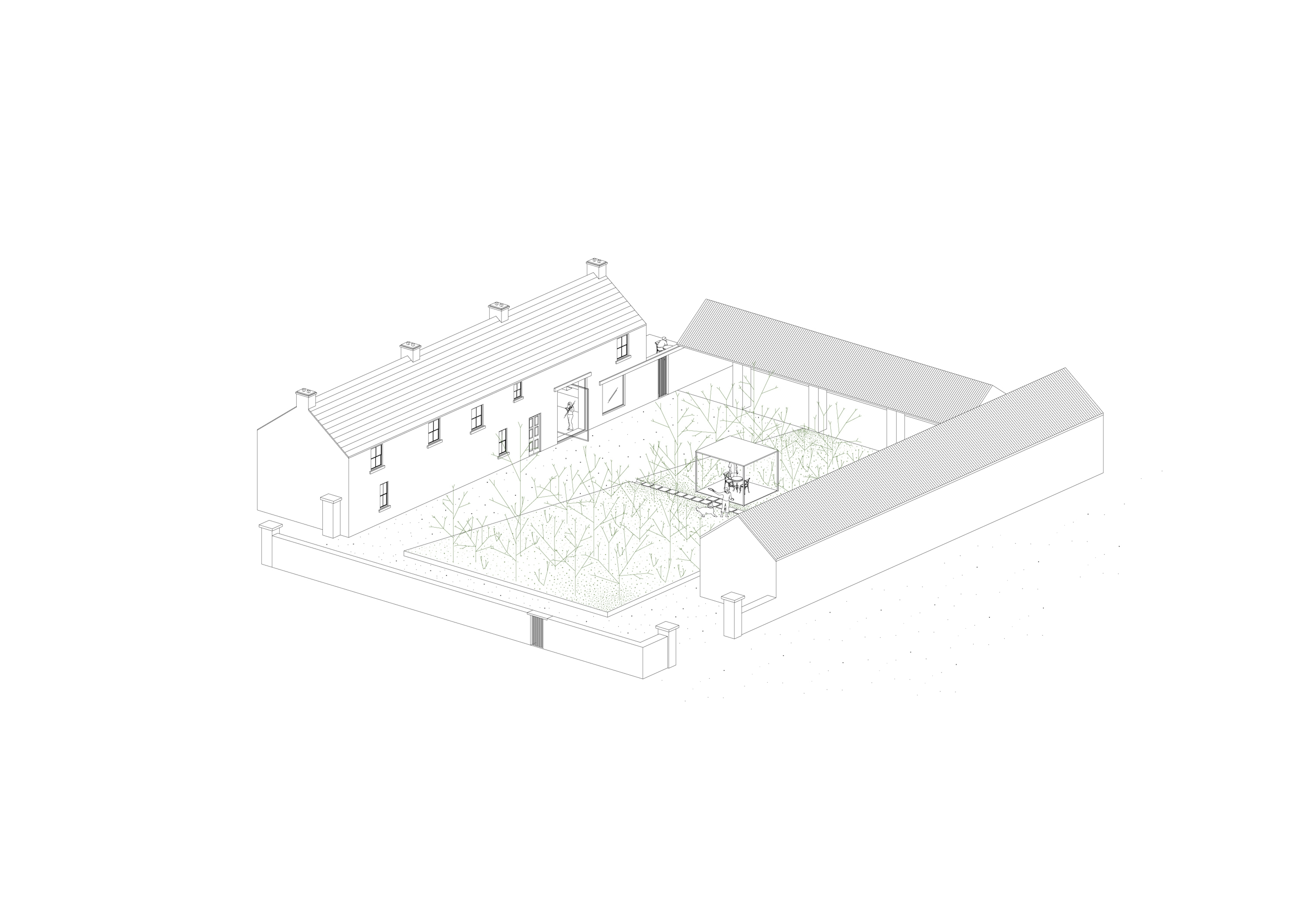 We have been commissioned to remodel and reconstruct an existing fire damaged barn just outside of Tuam, Co. Galway. Our proposals take advance of the existing buildings position within the 105 acre site. The layout is split into three wings of accommodation, centered around a new landscaped courtyard. The larger two storey volume holds the primary accommodation and living spaces. The low single storey volume directly across the courtyard will house a separate guest cottage, a fully equipped gym and a generous home office. The third volume is retained as an open air loggia that connects the two accommodation buildings, sheltered from the harsh weather.