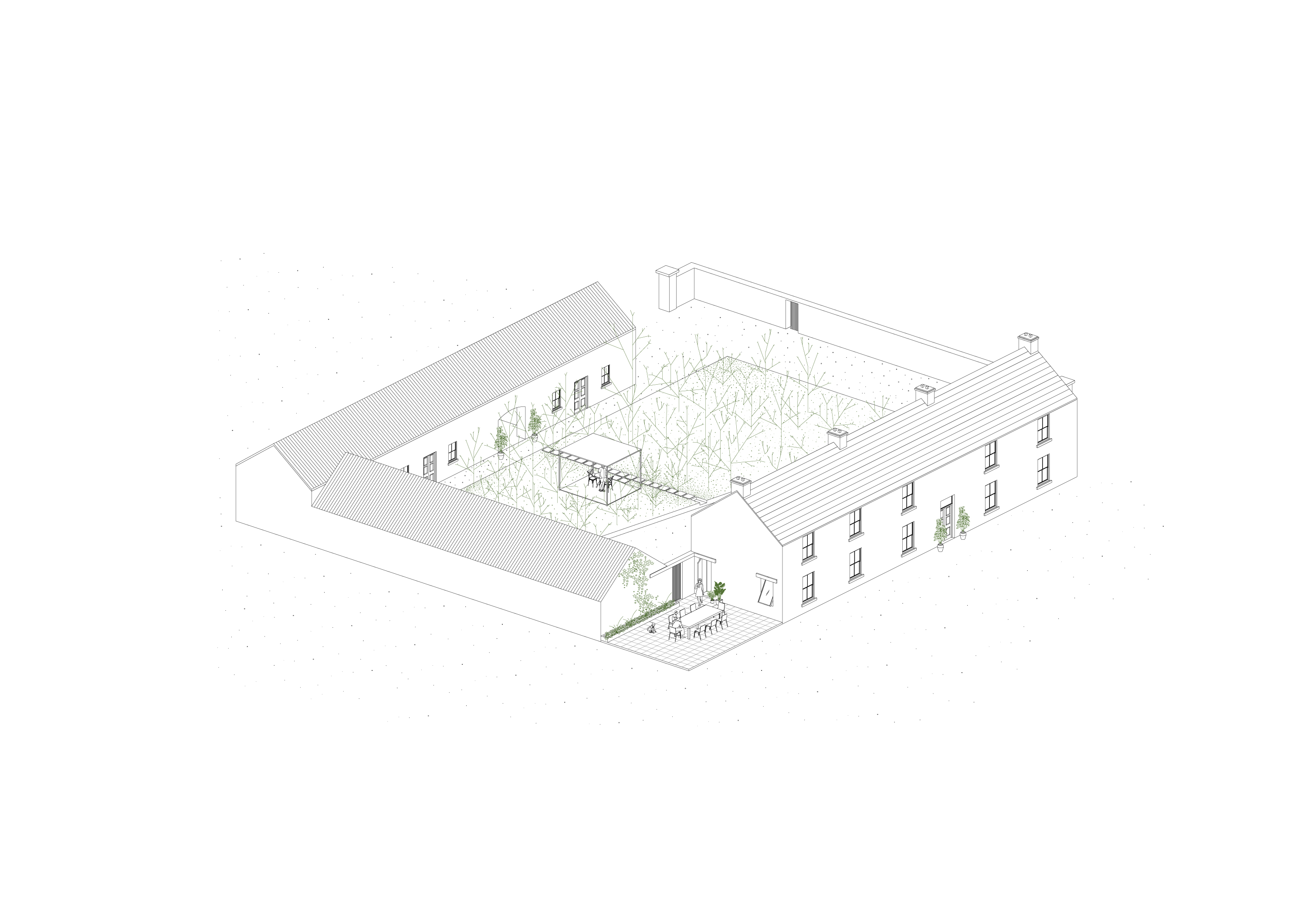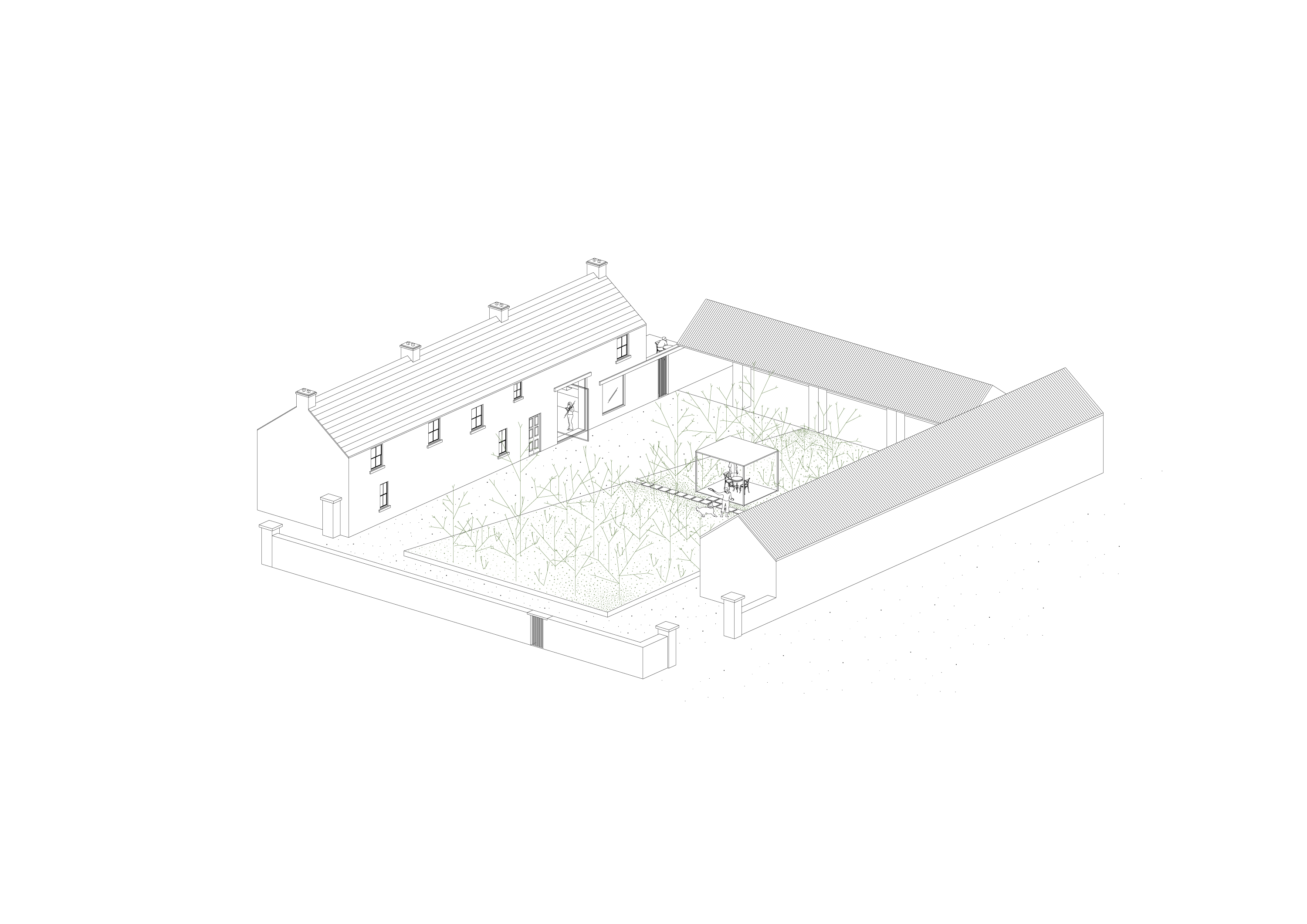 We have been commissioned to remodel and reconstruct an existing fire damaged barn just outside of Tuam, Co. Galway. Our proposals take advance of the existing buildings position within the 105 acre site. The layout is split into three wings of accommodation, centered around a new landscaped courtyard. The larger two storey volume holds the primary accommodation and living spaces. The low single storey volume directly across the courtyard will house a separate guest cottage, a fully equipped gym and a generous home office. The third volume is retained as an open air loggia that connects the two accommodation buildings, sheltered from the harsh weather.